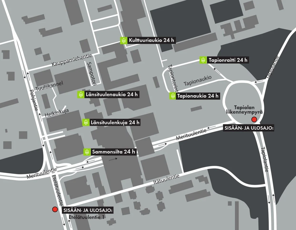 Tapiola Park -pysäköintihalli on avoinna maanantaista lauantaihin klo 4.45–24 ja sunnuntaisin klo 5.45–24. Ulosajo ympäri vuorokauden.